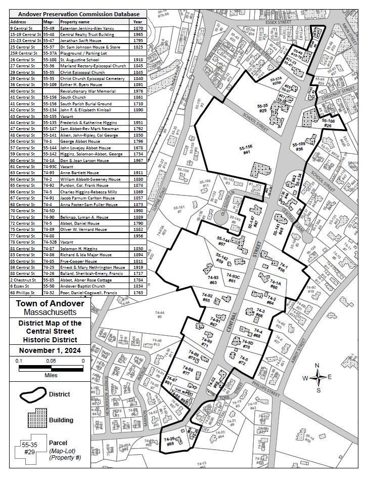 The Central Street Historic District passed overwhelmingly at the Andover's Annual Town Meeting on April 29, 2025. The Central Street Historic District Commission was appointed in the summer of 2025 and will implement the Bylaw.
