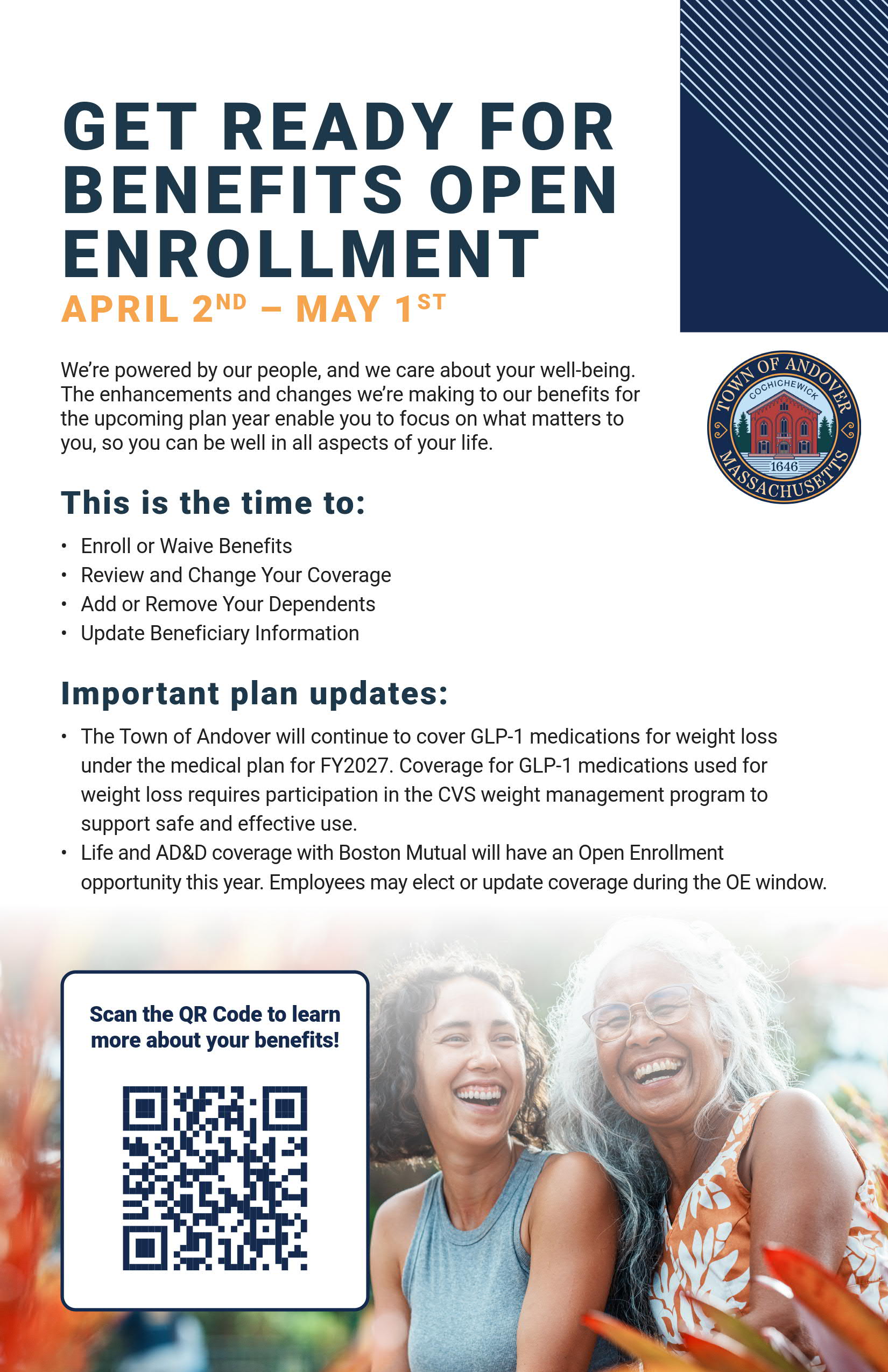 Please note that the updated FY2027 premium rates will be posted at the time Open Enrollment starts. If you have any questions regarding Open Enrollment before the enrollment window opens please contact the Town HR benefits department at benefits@andoverma.us or call us at 978.623.8960
